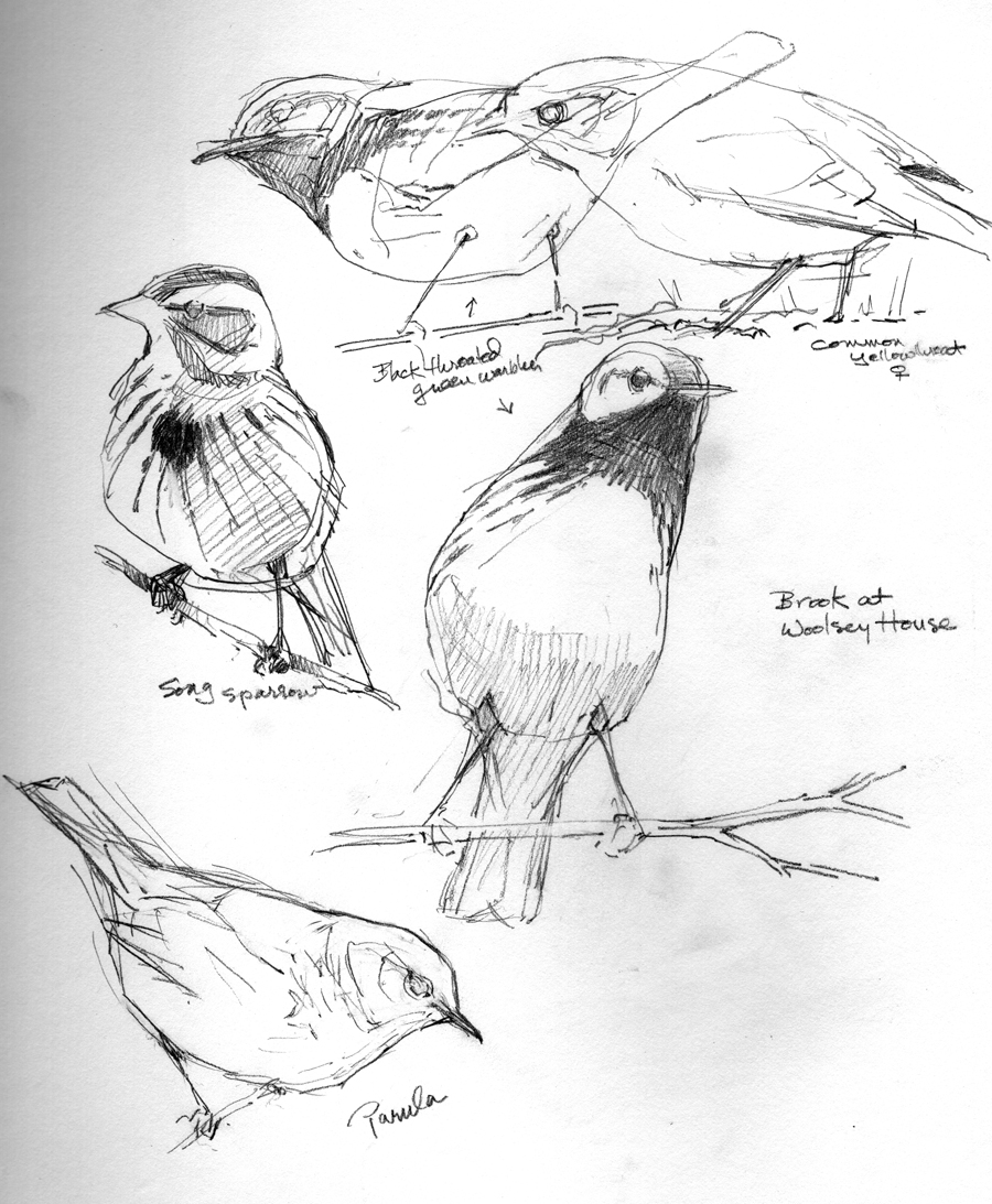 It’s just been a carnival of migrants in the last two weeks or so. On territory or just passing through, in waves or just a few at a time- not hard to see in the barely-leafed out treetops- they’re wonderful to watch, and a frustrating but rewarding challenge to draw. Great practice, on the fly.