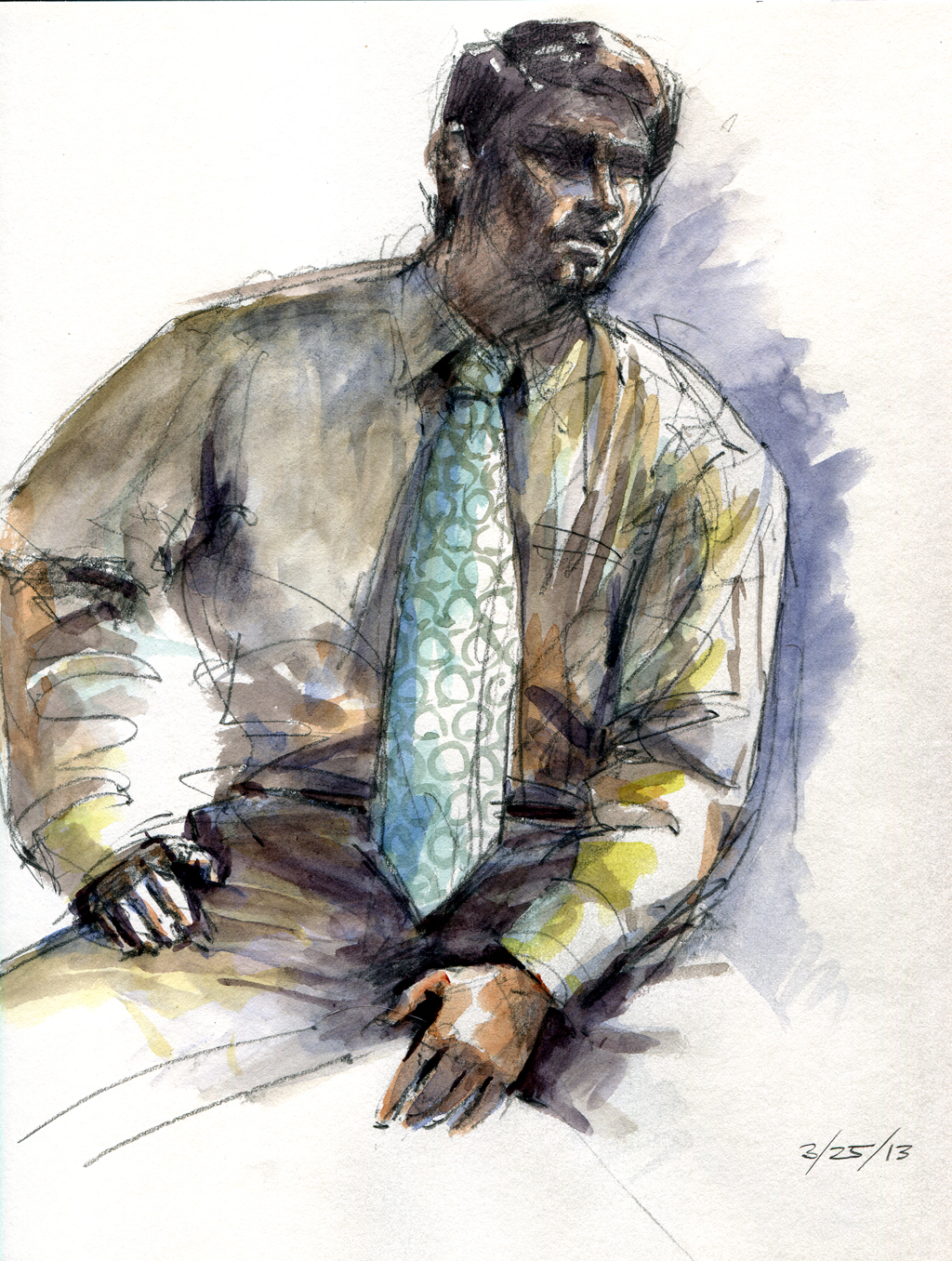Leaning in to close the deal. 40 minute pose. Watercolor over pencil,  8 1/2″ x 11″ Stillman & Birn Gamma Series sketchbook.