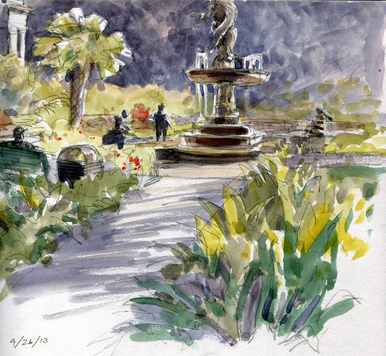 Fountain in Audubon Park, New Orleans, alive with strolling dog walkers, bicyclists and roller bladers out to catch a breeze on a warm April afternoon. One shirtless denizen biked hands-free, head thrown back, singing show tunes. The fountain is flanked by bronze babies riding on turtle back, playing a sly joke on the thirsty passer-by, because right below each turtle’s tail is drinking-water fountain. If you lean in for a slurp, you appear to be kissing the turtle’s bottom.