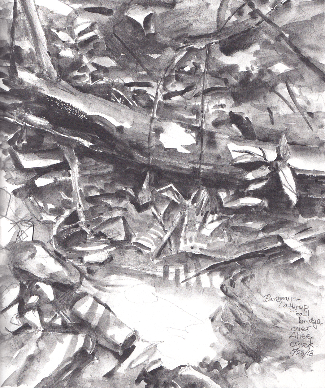 A lovely rill running down the Allee ravine. Painted while standing on a footbridge of the Barbour Lathrop trail. Water soluble graphite on Stillman & Birn Alpha Series 8 1/2 x 11 hardbound sketchbook.