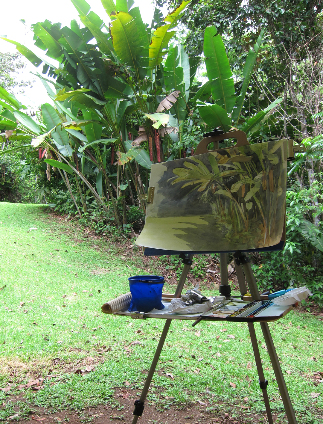 Painting big leaves in paradise is about my speed right about now. Watercolor on Arches cold press, 22″ x 15″.