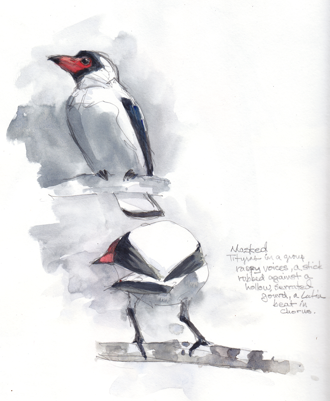 Masked tityras, roving bandits of the canopy…actually, they were snooping around a fruiting fig. I plan to snoop around there  myself. From 5 to 25 second poses, watercolor over pencil on S&B Alpha Series 8 1/2″ x 11″