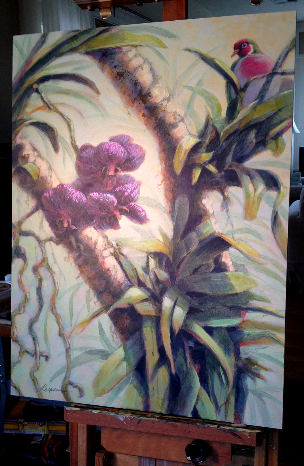 Vanda orchid and Jamba fruit dove, joined together in a festive eye-candy scuffle. Acrylic on cradled board, 28" x 24".