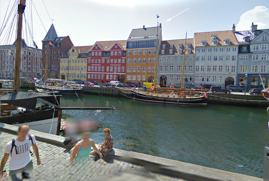 Our Copenhagen living quarters (follow the arrow) look like something out of a fairy tale. Just ask Hans Christian Anderson. He lived there from 1871 to 1874. Photo by Google Street View, blurry legless people and all.