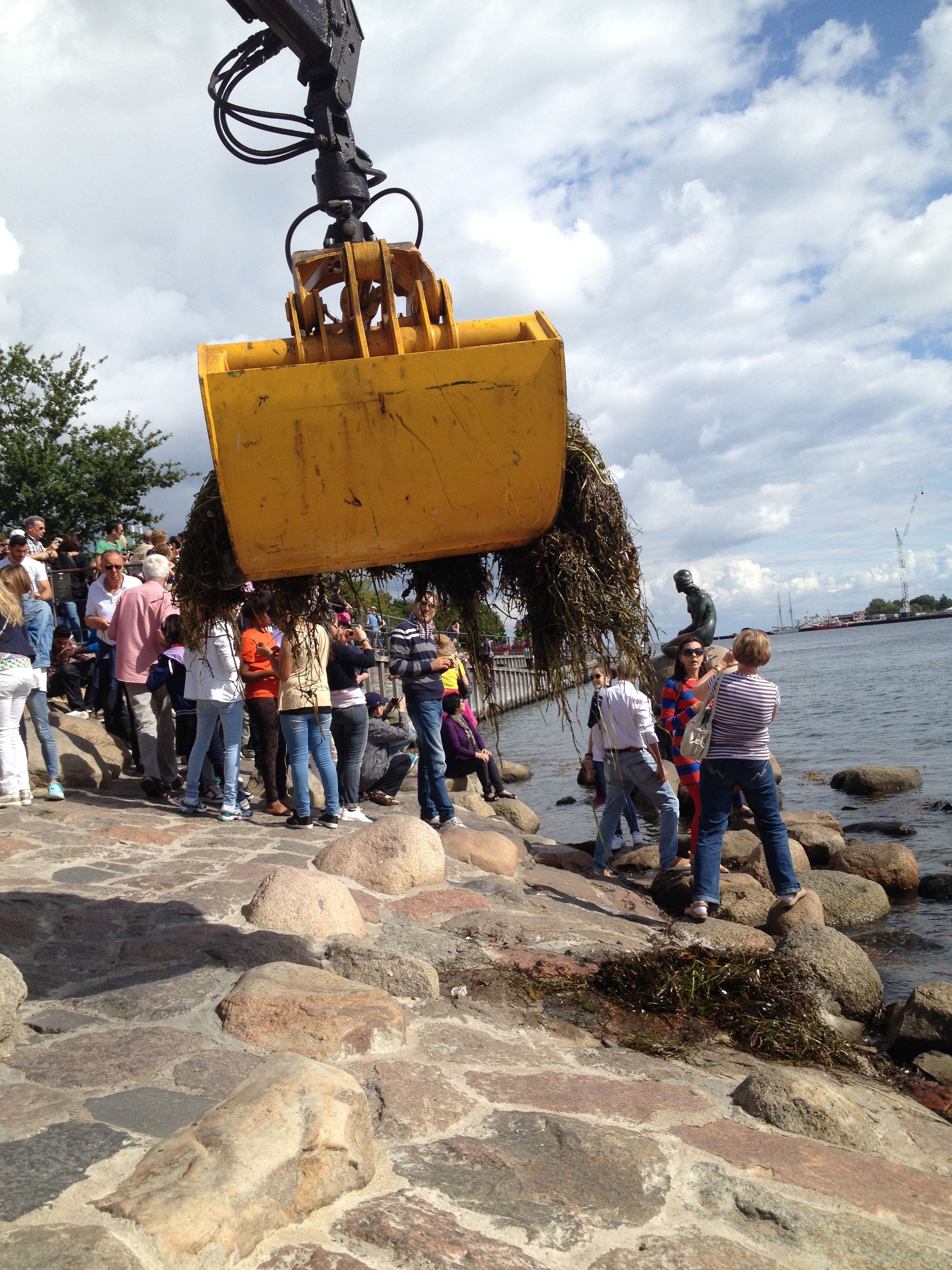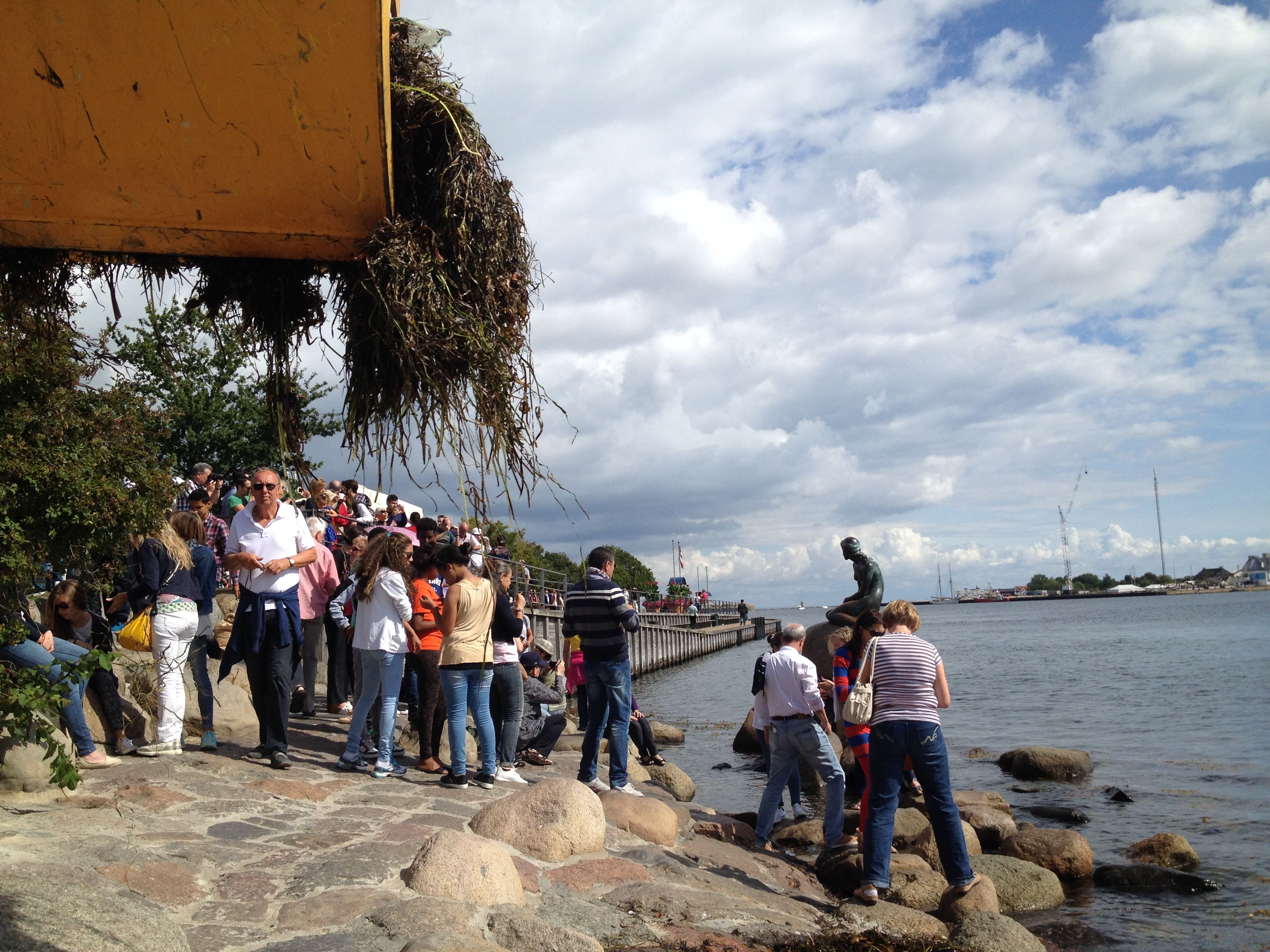 This morning I took a walk up to the statue of the Little Mermaid, the city’s beloved icon. Hans Christian Anderson is much on the mind as we are living in his old digs in Nyhavn. On my Kindle are his collected stories- 168 of them. They make me weep. I have to read with a hankie in hand. The statue is life-sized (assuming mermaids are the same size as humans) and bronze; she is perched on a softly rounded boulder. There were tidy piles of kelp lined up all along the water’s edge, spaced exactly 20 feet apart, some sort of neatness campaign, I supposed.