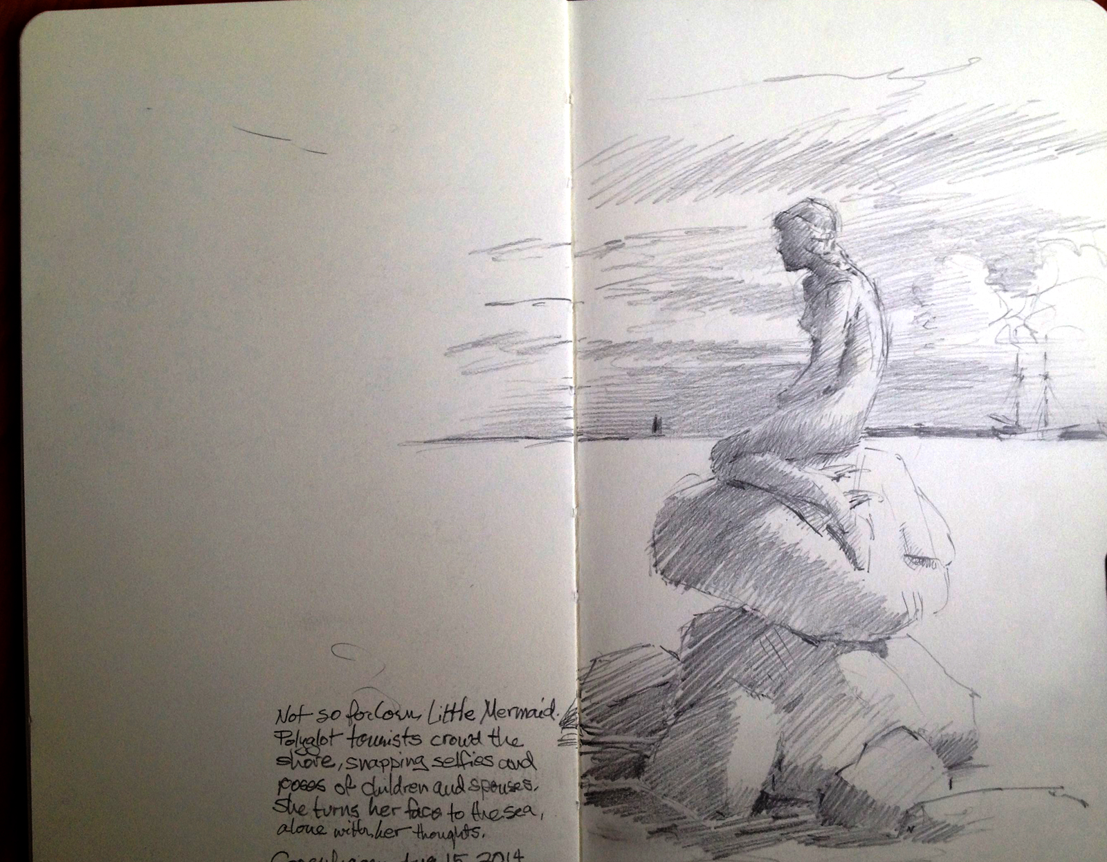 Little Mermaid turns her face from the crowd, wishing she'd worn her good fins. Mechanical pencil (.7) in Moleskine sketchbook.