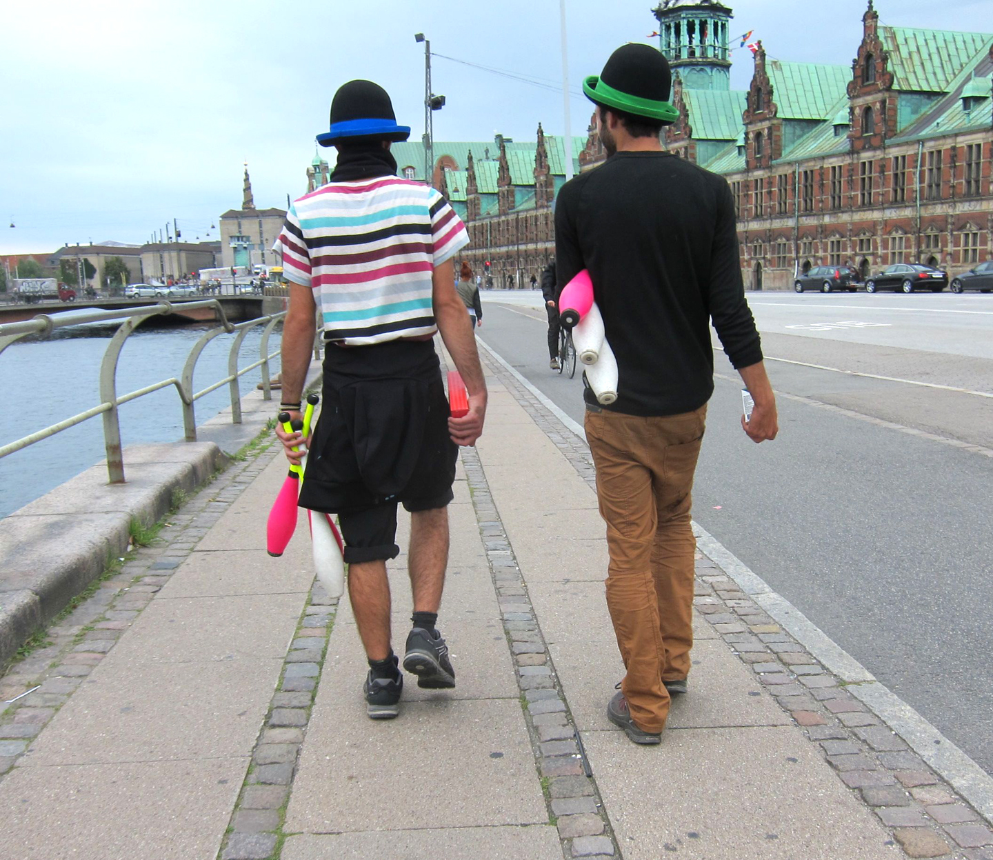 Jugglers walking on Slotsholms Canal, Copenhagen.