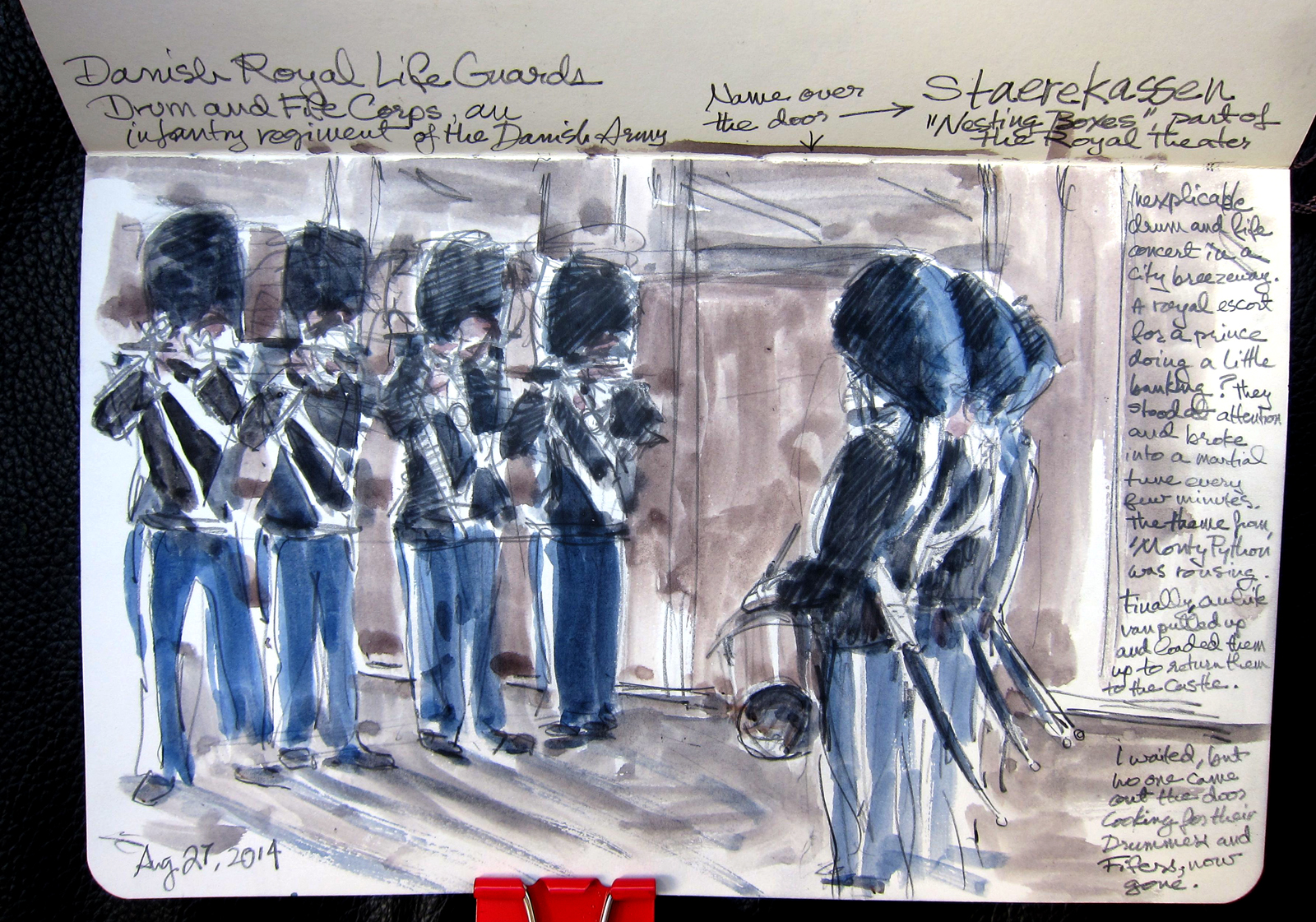 The Danish Royal Army’s Fife and Drum Corps playing on the street in Copenhagen. Watercolor over pencil, Moleskine 5 x 8.