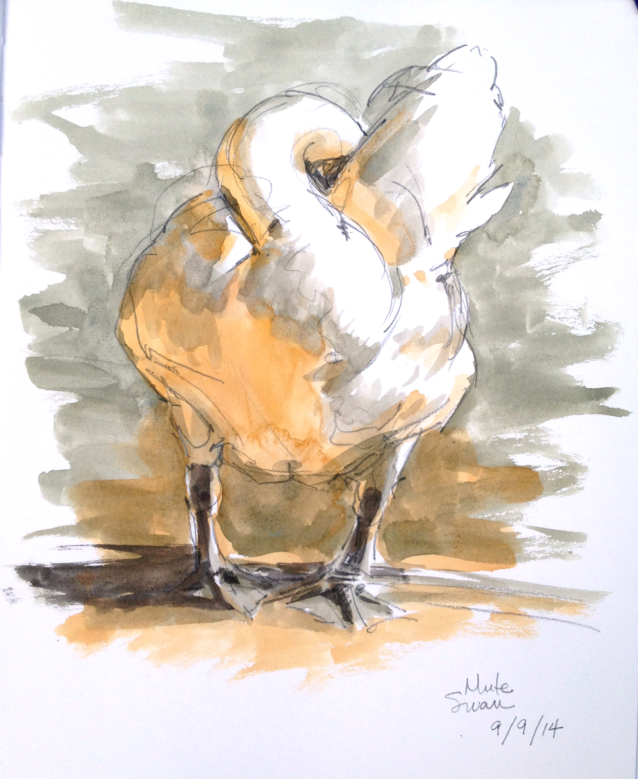 A mute swan checks under the hood. Sketched through a scope at the edge of the jagged lake around Christianshavn’s ramparts. Christianshavn, a lovely, idiosyncratic neighborhood of Copenhagen, exists on its own little island. Watercolor over pencil, Stillman & Birn 8 1/2″ x 11″ Alpha Series sketchbook.