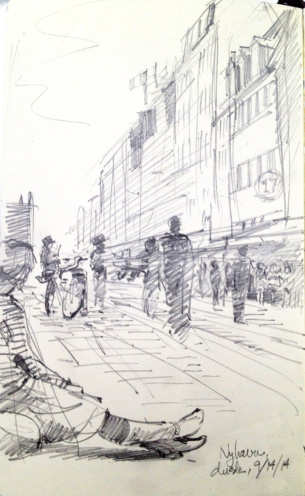 Perspective on Nyhavn Canal. Antman and I have begun a small new tradition in which, at the end of the day, we take a couple of Carlsberg beers down to the wharf's wood edge and watch the passing show. We listening to street music, to the creaking of ropes and spars on the moored ships, to the crying of gulls. It's cheap entertainment. Mike usually reads, I usually sketch. Here, a street guitarist sings, people walk, sidewalk cafes are busy, and a young woman in nice leather boots rests her feet and listens to the music, too. Pencil on Moleskine 5 x 8 sketchbook.