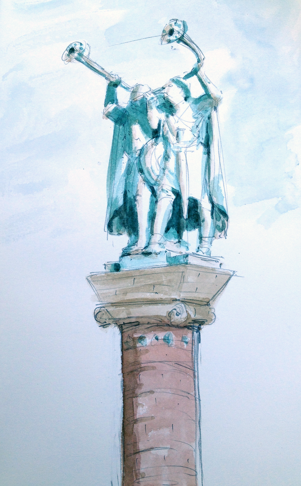 Lure blowers atop a pedestal by Town Hall (Radhuset), Copenhagen. A “lure” is an ancient Norse horn, dating back to 1800 b.c. or so. That would be The Bronze Age, a substance which, as luck would have it, the statue is made out of. Although these lure players are truly awesome, today we should have been in Montpellier, followed by another two days in Arles. I could have sketched in the unsteady footsteps of Vincent Van Gogh. Or watched flamingoes and wild ponies from the nearby marshes of the Camargue, or haggled for sea salt and leather jackets in the open-air market of Arles. But Air France is experiencing a mashup of their own, mon Dieu! and cancelled all flights, c’est la vie. Instead, we will enjoy the gracious lure blowers and the rich pageantry of Danish life in the great city of Copenhagen. Rather than lollygagging unprofitably about in the south of France, I got my hair cut, bought light bulbs and found a pair of cute pink flip-flops, 50% off.Also enjoyed a pot of jasmine tea this afternoon in a tea room dating back to the 18th Century, which, I think, was the last time they decorated. It’s within the Copenhagen Museum in a building once occupied by the Royal Copenhagen Shooting Society, founded back in 1443. Time just flew.