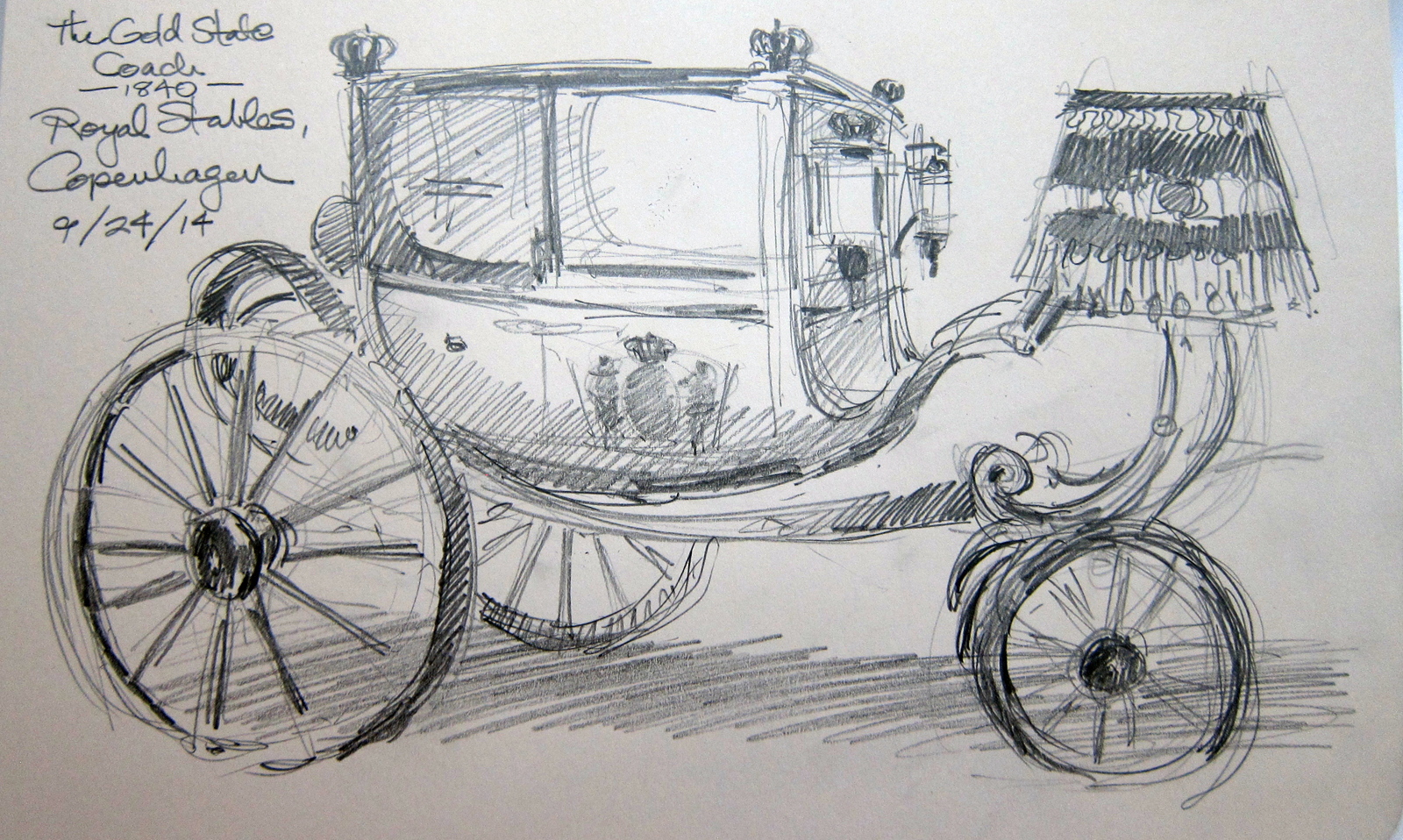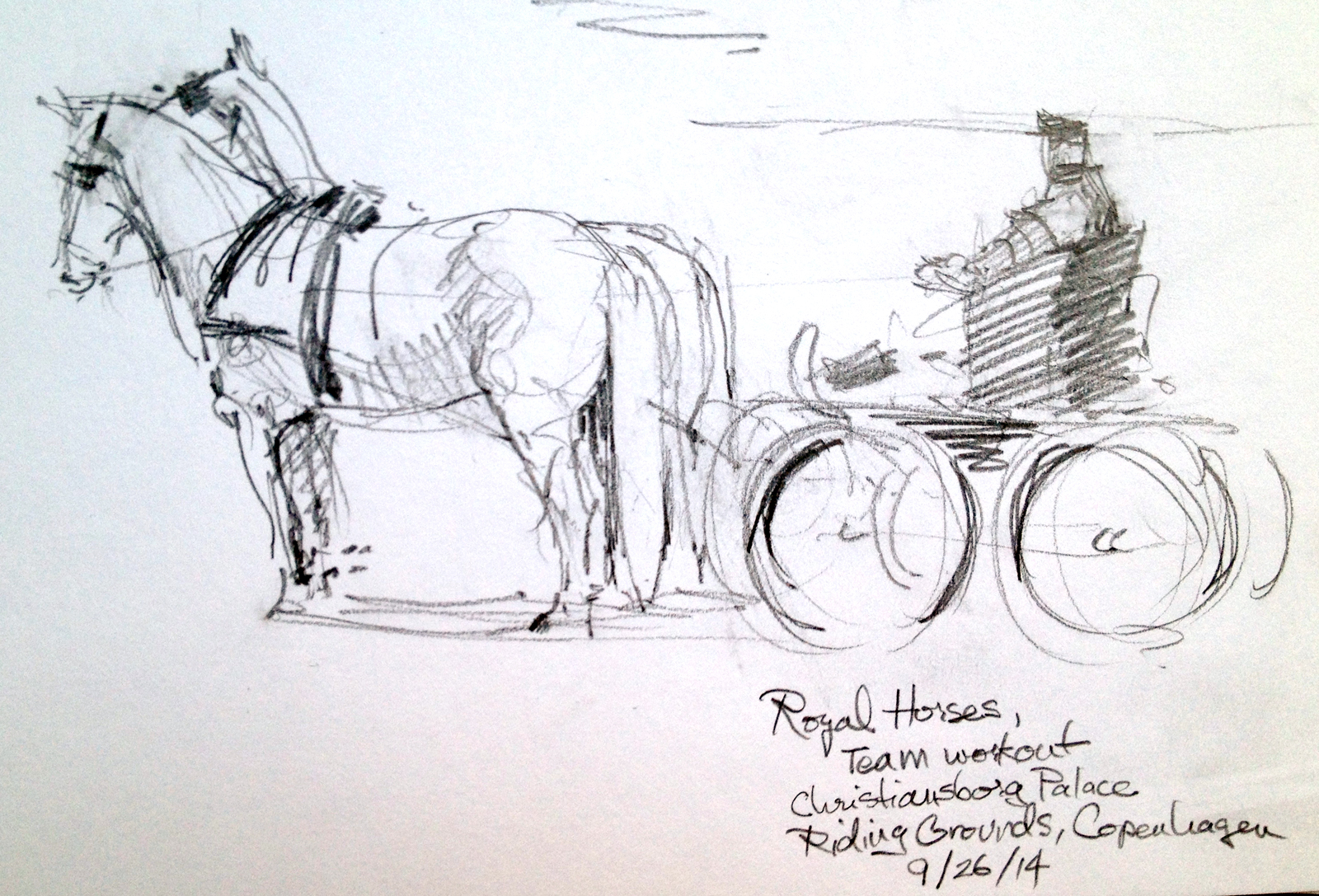 Every morning the Royal steeds get a good workout in the huge riding ring behind Christiansborg Palace in Central Copenhagen, practicing their coach-drawing skills, staying in shape for Royal events requiring equestrian services. Come to think of it, it’s a good place to practice my coach-drawing skills, too. According to a sign at the entrance to the Royal Stables, these beautiful white horses are Kladrubers, a breed from the Czech Republic. They are born dark gray and age gradually into their white coats. Some still have some gray dappling. Pencil and watercolor wash on Stillman & Birn Alpha Series Sketchbook.Speaking of coach-drawing, here’s the Royal Coach, all fitted out in gold, with plush tufted pearl gray interior and an elaborate suspension system beneath. The big wheels are rubber coated-but they can’t possibly cushion the ride entirely over Copenhagen’s cobblestone pavement. I imagine the Royal Family likes to keep these trips short. Maybe just lunch and a little shopping. Pencil on Moleskine 5 x 8 Sketchbook.The Marble Bridge from Christiansborg Palace, Copenhagen, across which the King’s coaches have rolled to town since 1744. Watercolor wash over pencil, 8 1/2 x 11 Stillman & Birn Alpha Series Sketchbook.A team of two white horses draws the little rig and driver. I don’t know what the official name for the vehicle is. Buggy? Mini-coach? Cabriolet? Practice-Phaeton? Whatever it was, it was lovely to watch them work. Pencil on Stillman & Birn Alpha Series sketchbook.The Danish Royal Stables at Christiansborg Palace, Copenhagen. It once housed 270 horses, back in the day before cars (and bicycles, probably) had been invented; today they hold about 20 horses. The first thing that hits you when you step inside is a feeling of great well-being, along with the scent of hay and very well-cared-for horses.