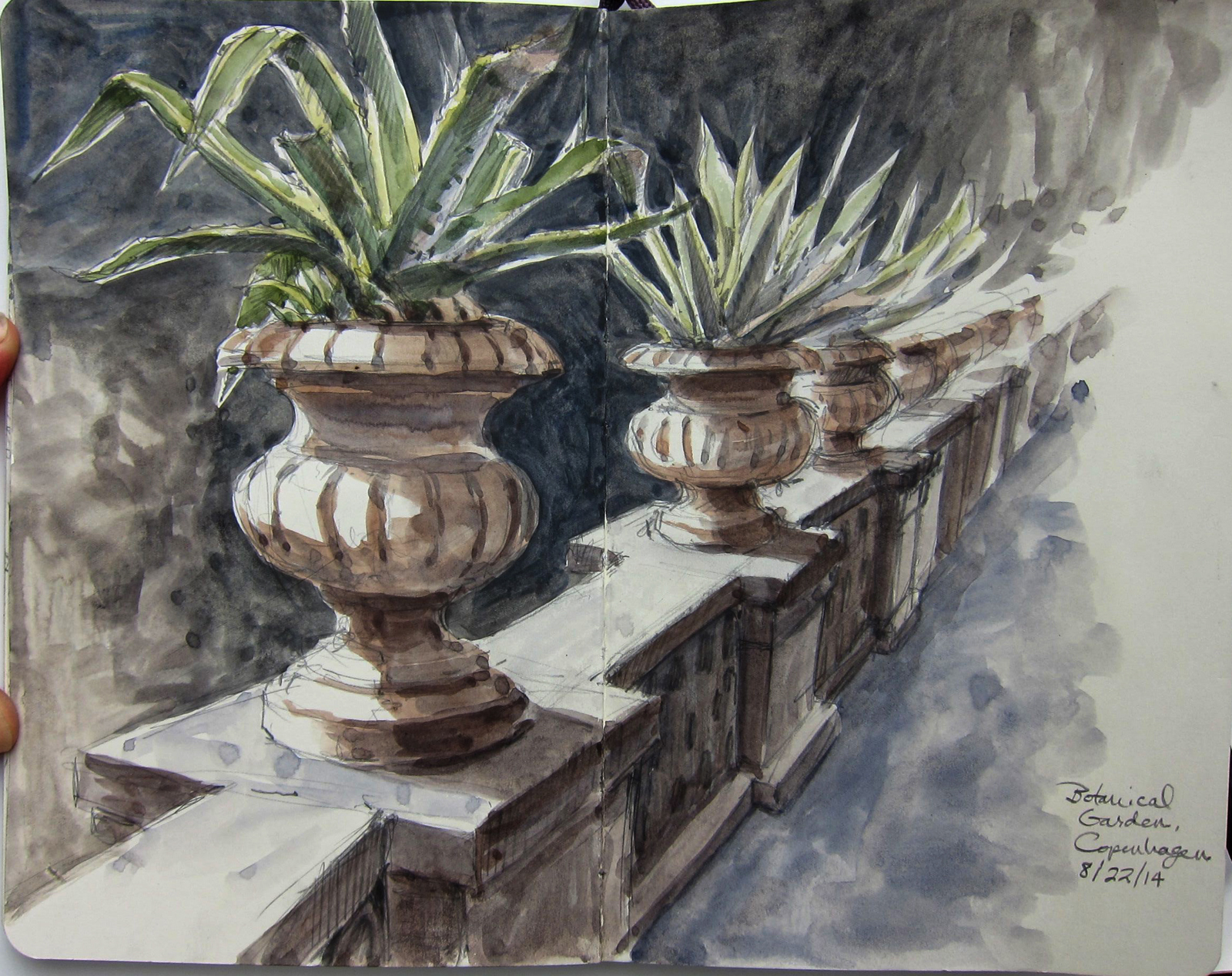 This is what art is truly good for: catching sunlight on potted plants in August to save up for a cold rainy day in September. These agaves are planted in formal urns along the balustrade of the grand Victorian iron-and-glass hot-house at Copenhagen’s Botanical Garden. Come to think of it, the Victorian hot-house could be a dandy spot for some upcoming Danish winter-weather natural history drawing. At least it’ll be warm. Watercolor and pencil in Moleskine 5″ x 8″ sketchbook.