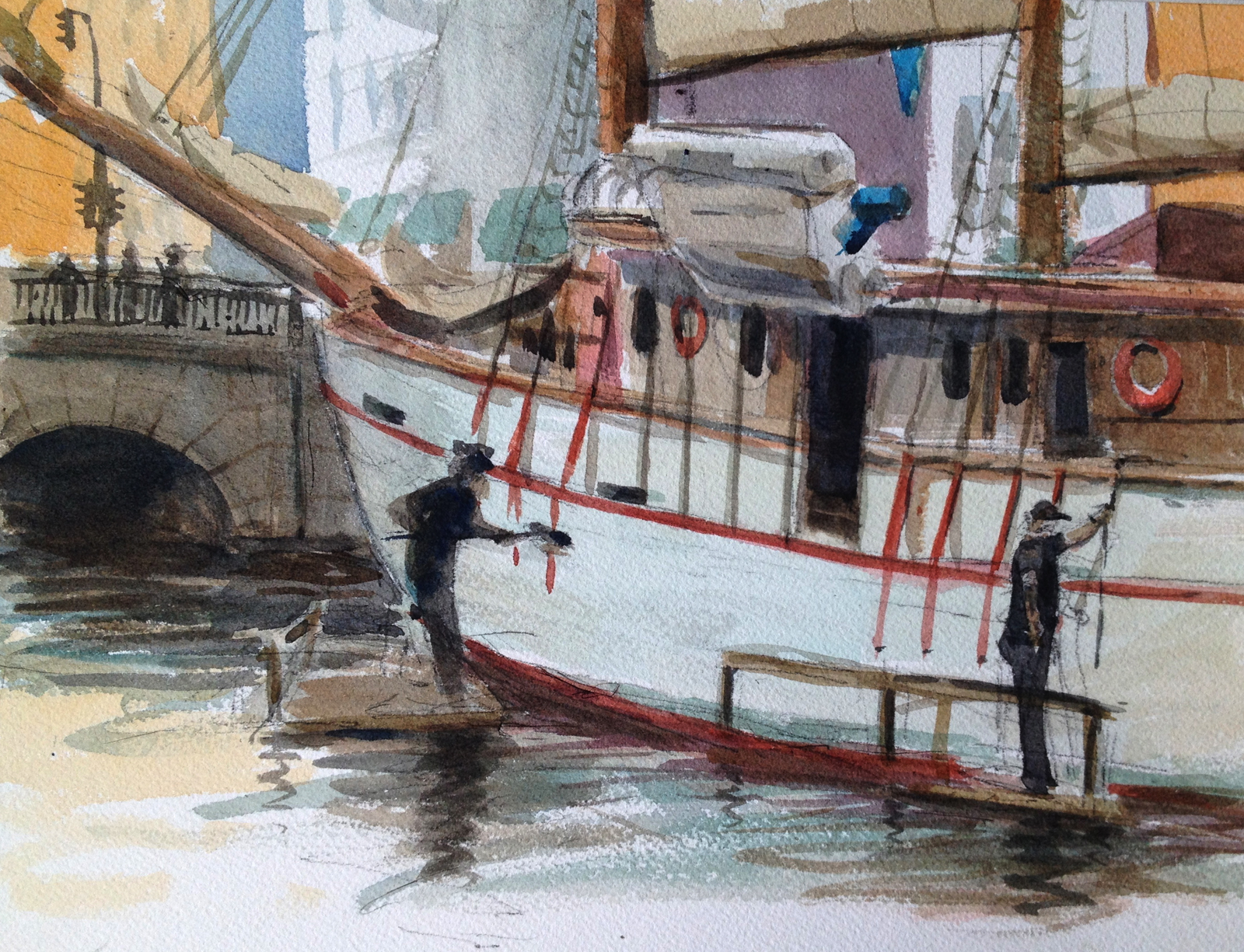 Two boat washers on Nyhavn Canal scrub the sides of one of the ships moored to the quay. They washed this one for over an hour before moving on to the next one. Some ships are double-parked, tied alongside another to save space, leaving a center channel wide enough for tour boats and mallard ducks. The washers worked standing on their wooden rafts, moving on to the next boat by pushing off and floating gently down the stream. Merrily, even. Watercolor over pencil on Arches 140 lb. cold press paper, 9″ x 12″