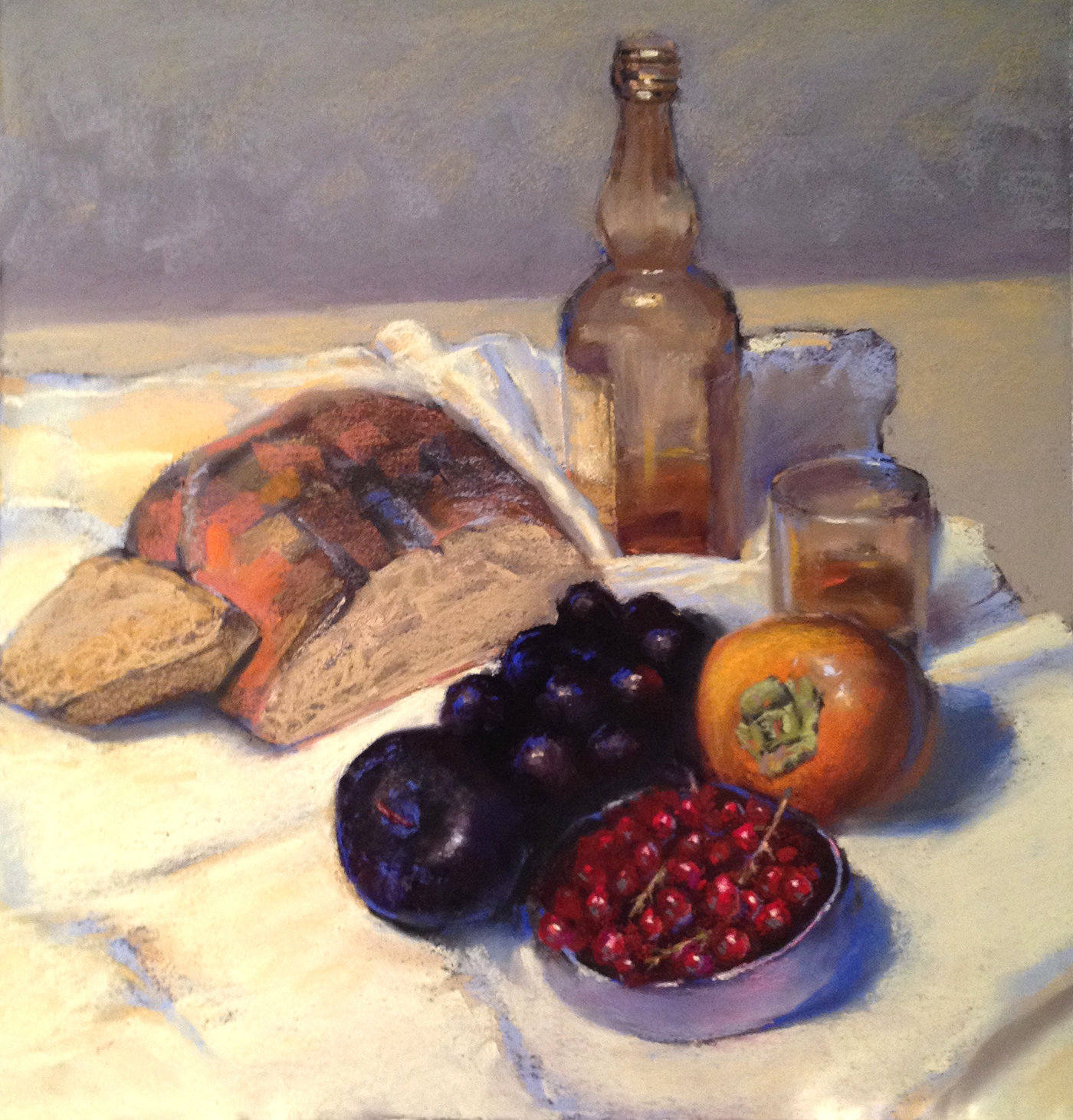 A light Danish snack, rendered in pastel. The bread should be thickly buttered and there should be smoked herring and sliced ham in the picture, but you get the concept. The beverage is Akvavit, the potent Scandinavian spirit flavored with caraway. It’s best served syrupy-thick straight from the freezer, preferably alongside smoked herring and buttered bread. The red currents are called “ribes” in Danish, purchased just yesterday from the foodie paradise Torvehallerne, which is a permanent farm market in the heart of Copenhagen and our favorite weekly shopping trip. Pardon me while I sip this akvavit. Pastel on sanded Artspectrum paper, 14″ x 16″.