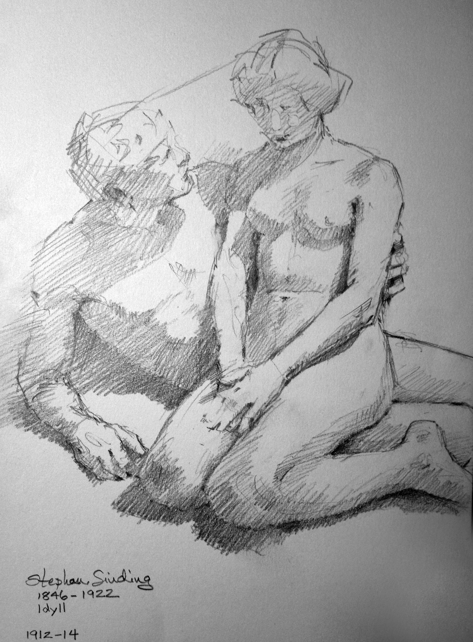 Idyll by Stephan Sinding, marble. Sketched at the Ny Carlsberg Glyptotek, the wonderful art museum in Copenhagen. So close to Tivoli Gardens you could hear the screams from the “The Golden Tower” through the marble walls. Pencil on Lana 1590 8 1/2″ x 11″ sketchbook.