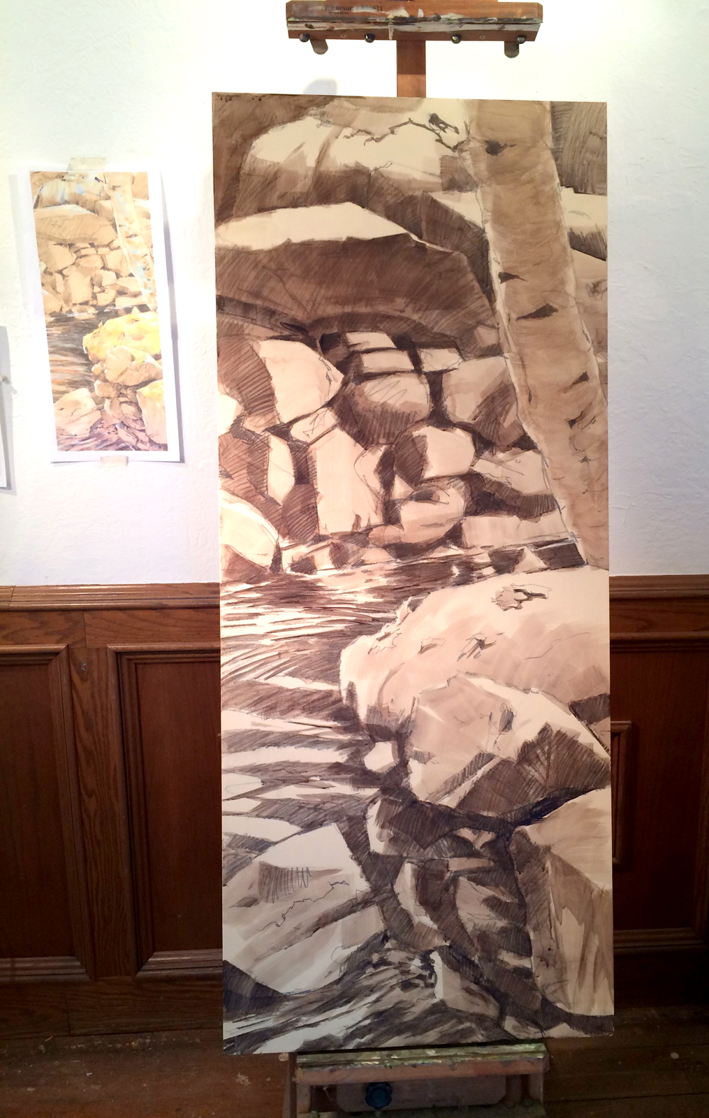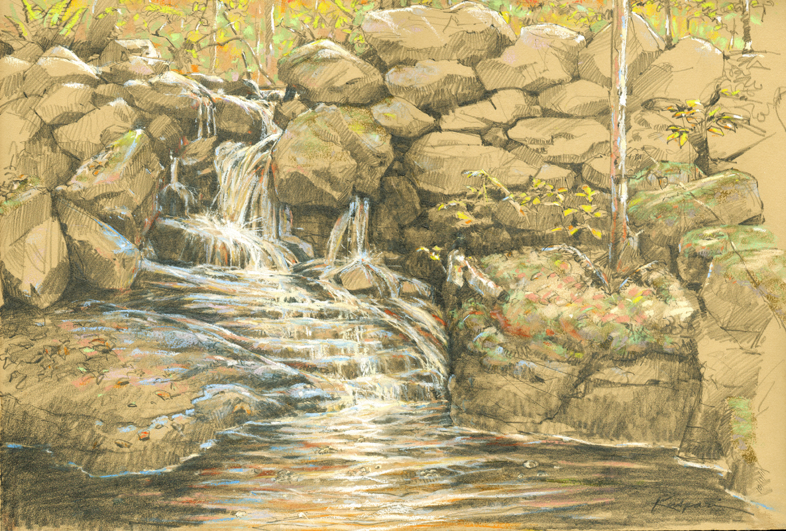 The drawing, made while standing on the mossy bank just downstream. Graphite and pastel on 22″ x 15″ Rives BFK tan paper.
