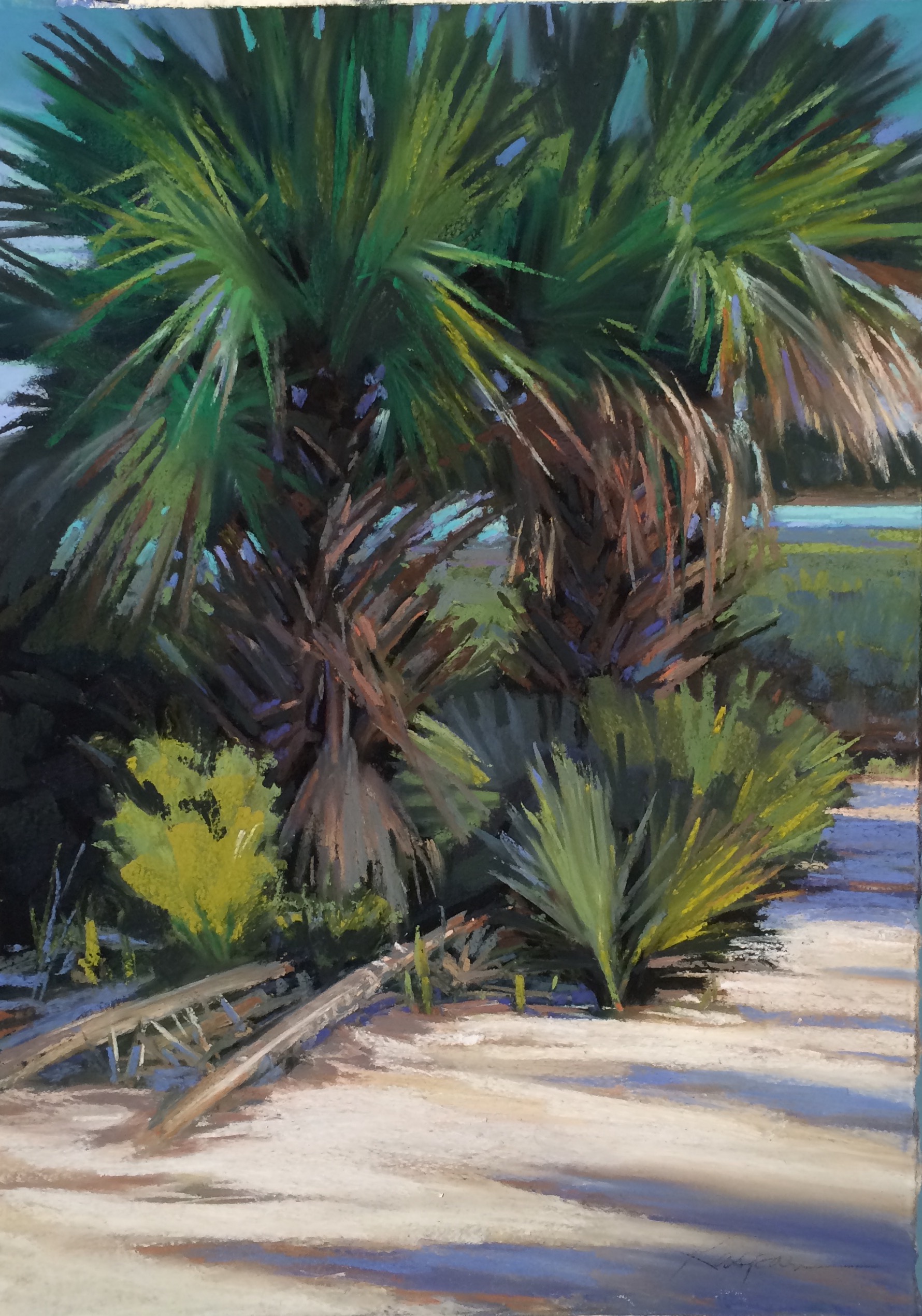 A view of palms at Callawassie Creek, Spring Island, South Carolina- with the marsh at high tide. Pastel on sanded paper, 12″ x 15″.