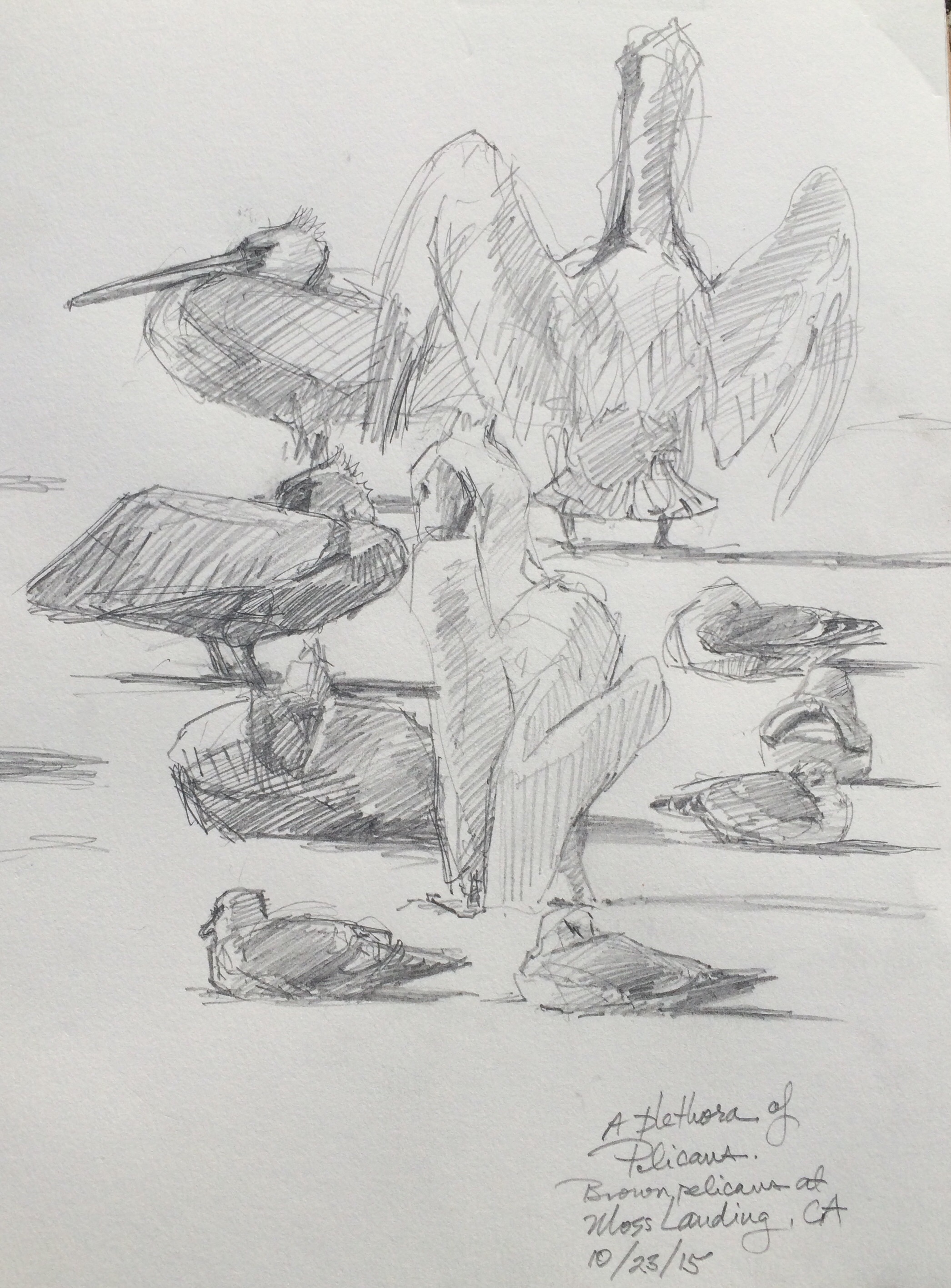 On the jetty at Moss Landing, drawing brown pelicans and California gulls, hearing sea lions bark and inhaling aromatic sea salt mixed with giant kelp. Almost edible.