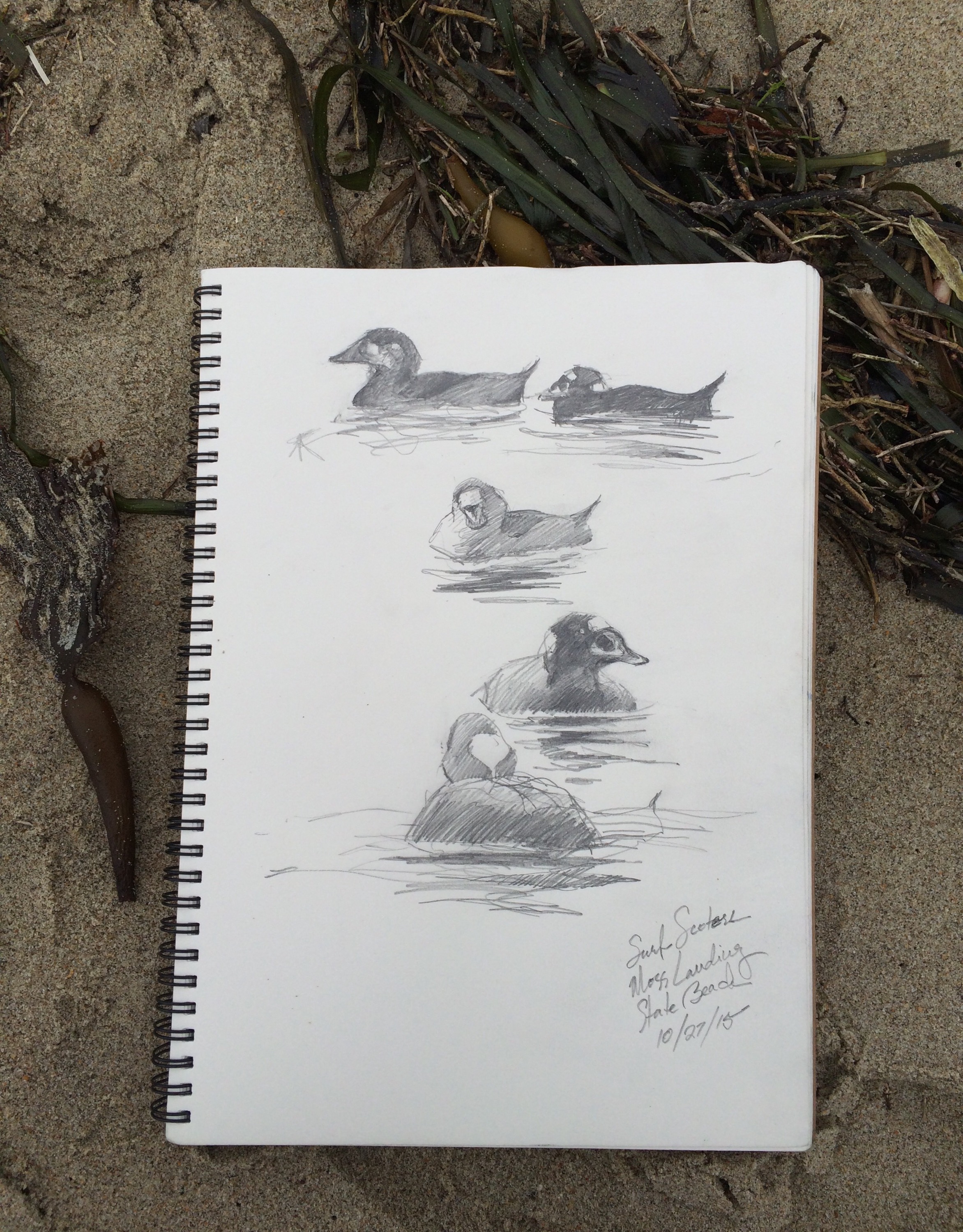 Surf Scoters Posted on October 27, 2015 by zeladoniac Posted in Uncategorized At Moss Landing State Beach sketching a fine raft of scoters in the gray-green sea. Lovely Pacific. Share this: Click to email a link to a friend (Opens in new window) Email Click to share on Facebook (Opens in new window) Facebook Click to share on X (Opens in new window) X Like Loading... Related