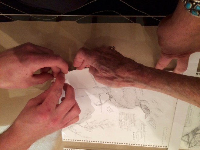 Perched on a Page, according to Museum of American Bird Art Director Amy Montague, set the MABA record for the most art objects in a single exhibit: over a dozen framed paintings, 10 framed drawings, over 105 unframed drawings, and a table case filled with sketchbooks opened to favorite drawings. Also, one of my DIY mint-tin watercolor kits, tastefully arranged with a well-used pencil and waterbrush.