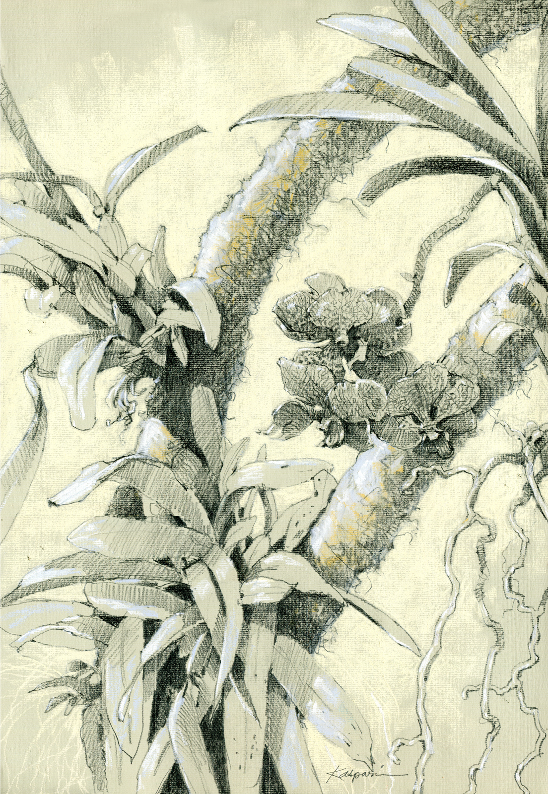 This is the original sketch of the vanda orchid used in this painting. It’s growing in the Crystal Bridge Conservatory right now. Can you find it?This is a Jambu fruit dove, found Old World tropics, but I drew it in Oklahoma City Zoo’s aviary.
