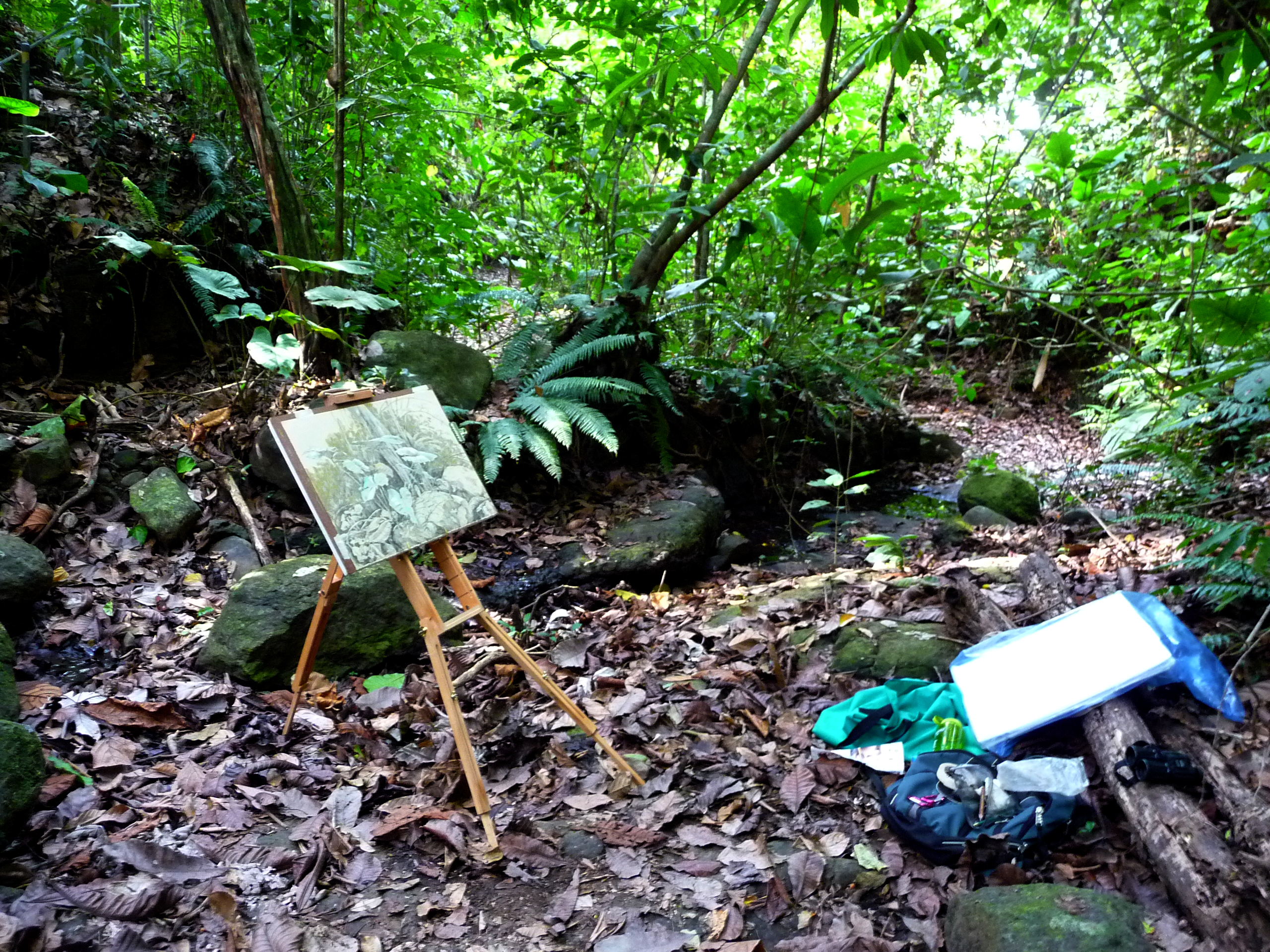 In the field, Barro Colorado Island, Panama. The dimness of the rainforest floor is counteracted by plants growing big leaves to catch every fleck of sunlight that comes their way. My forest studio. I was surrounded by singing birds and the sound of distant howler monkeys.