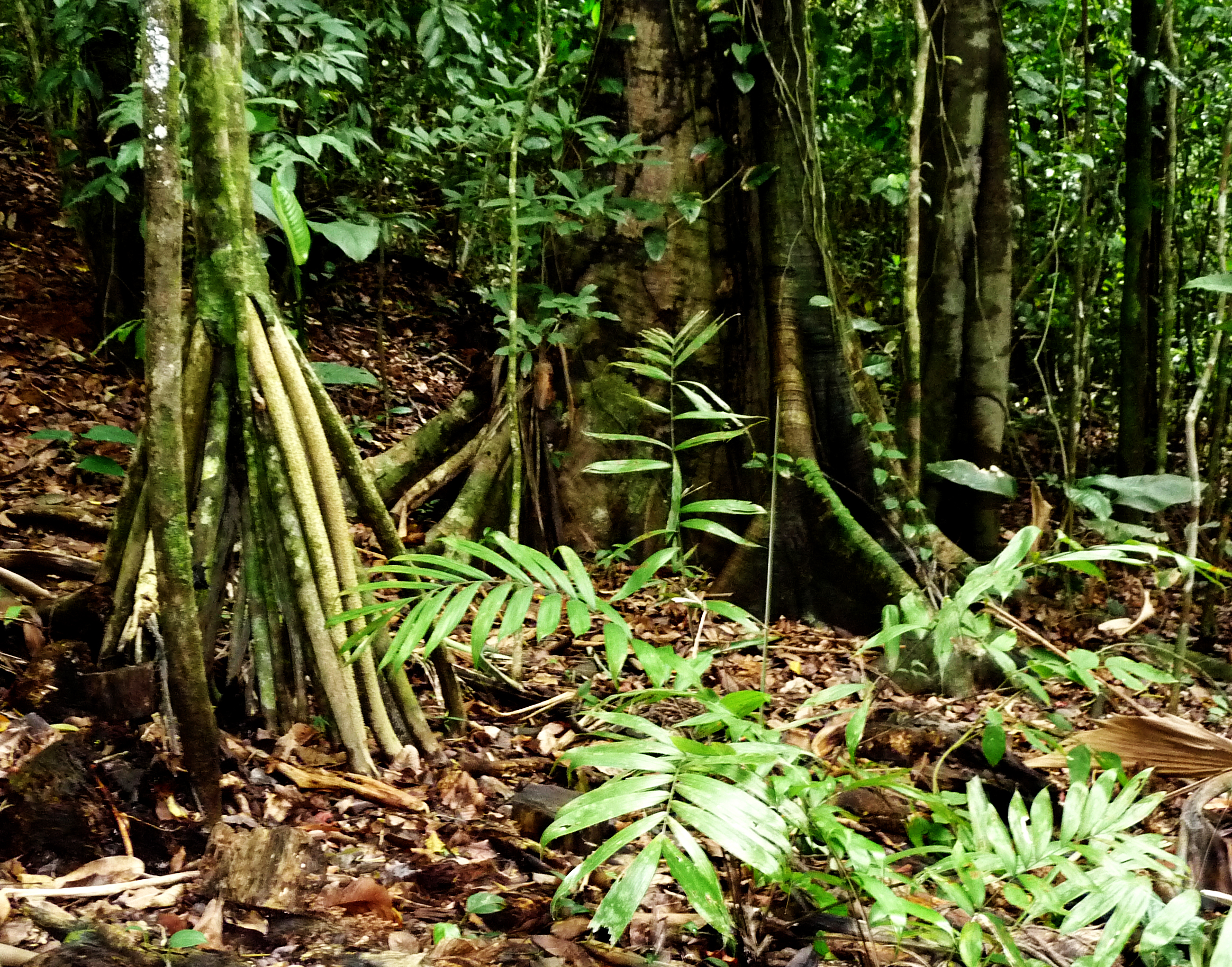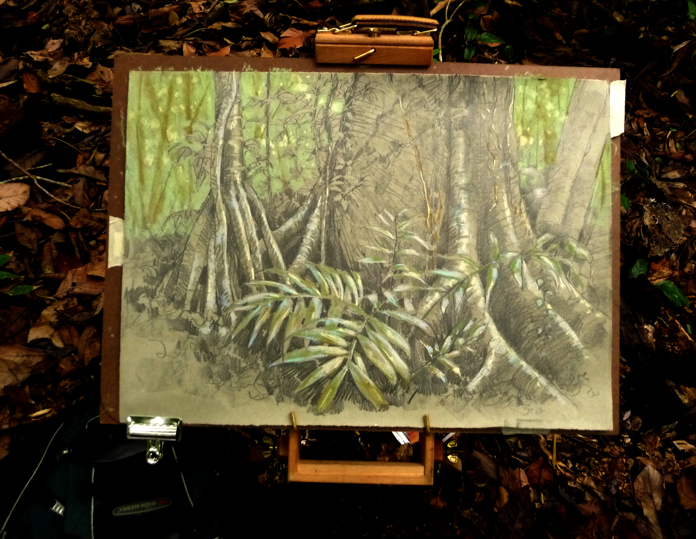 Drawing in the field.The stilt roots on the left are the base of a Socratea “walking palm”. Buttressed roots are also common in the rainforest. The soil here isn’t very deep, so they spread out wide to support the massive trees above, and to capture nutrients.