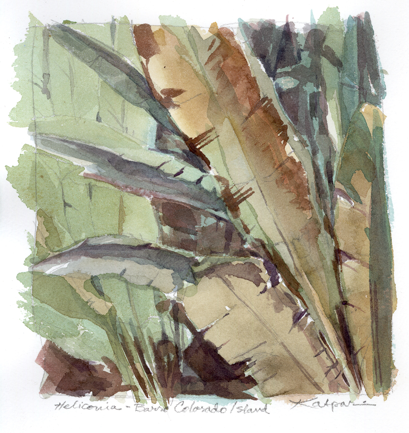 This tiny watercolor serves as the foliage for “Shadowplay”. It was painted from life on Barro Colorado Island, Panama. The original measures about 6″ x 6″.I stole the parakeets from another work, a mixed media drawing I’d done plein air (more or less) on Barro Colorado Island.