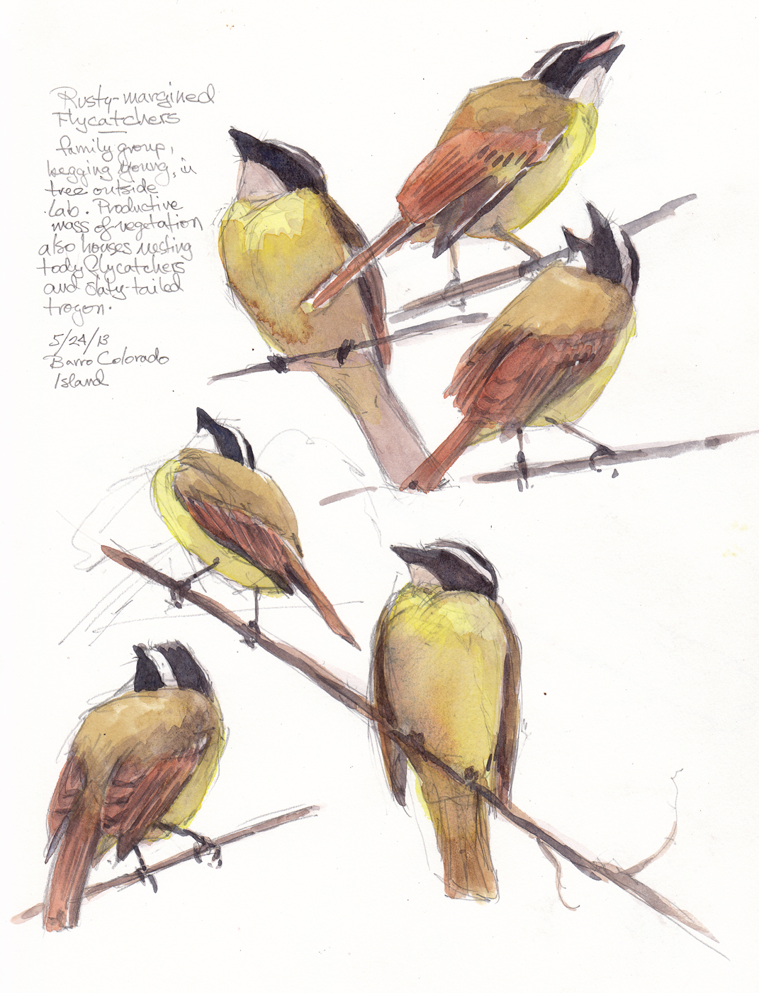 Rusty margined flycatchers, posing in tree branches in a clearing on Barro Colorado Island, Panama. Very vocal, common, easily confused with Social flycatcher, also very vocal and very common. Watercolor sketch, 2013.An understory calithea plant, rolling up its leaves like windowshades when the sun struck at noon. Watercolor sketch on Barro Colorado Island, Panama, 2013.