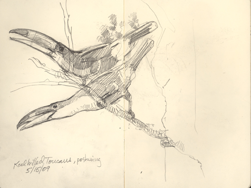 Dusky titi monkey, Peru. Listen to the sound of a whole troupe...Great tinamou and chick, PanamaKeelbilled toucan calling: listen to the "warm-up" ratcheting at the start. There's a red-capped manakin displaying nearby. Listen for the snaps and buzzes. Recorded in Panama.Chestnut-backed antbirds, recorded and sketched in Panama. The squirrel was there, too, an innocent bystander.